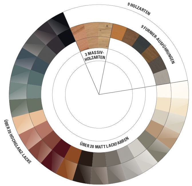 Je nach System wählen Sie aus über 20 Lackfarben in matt oder glänzend, 3 Massivhölzern und 9 Furnierausführungen.