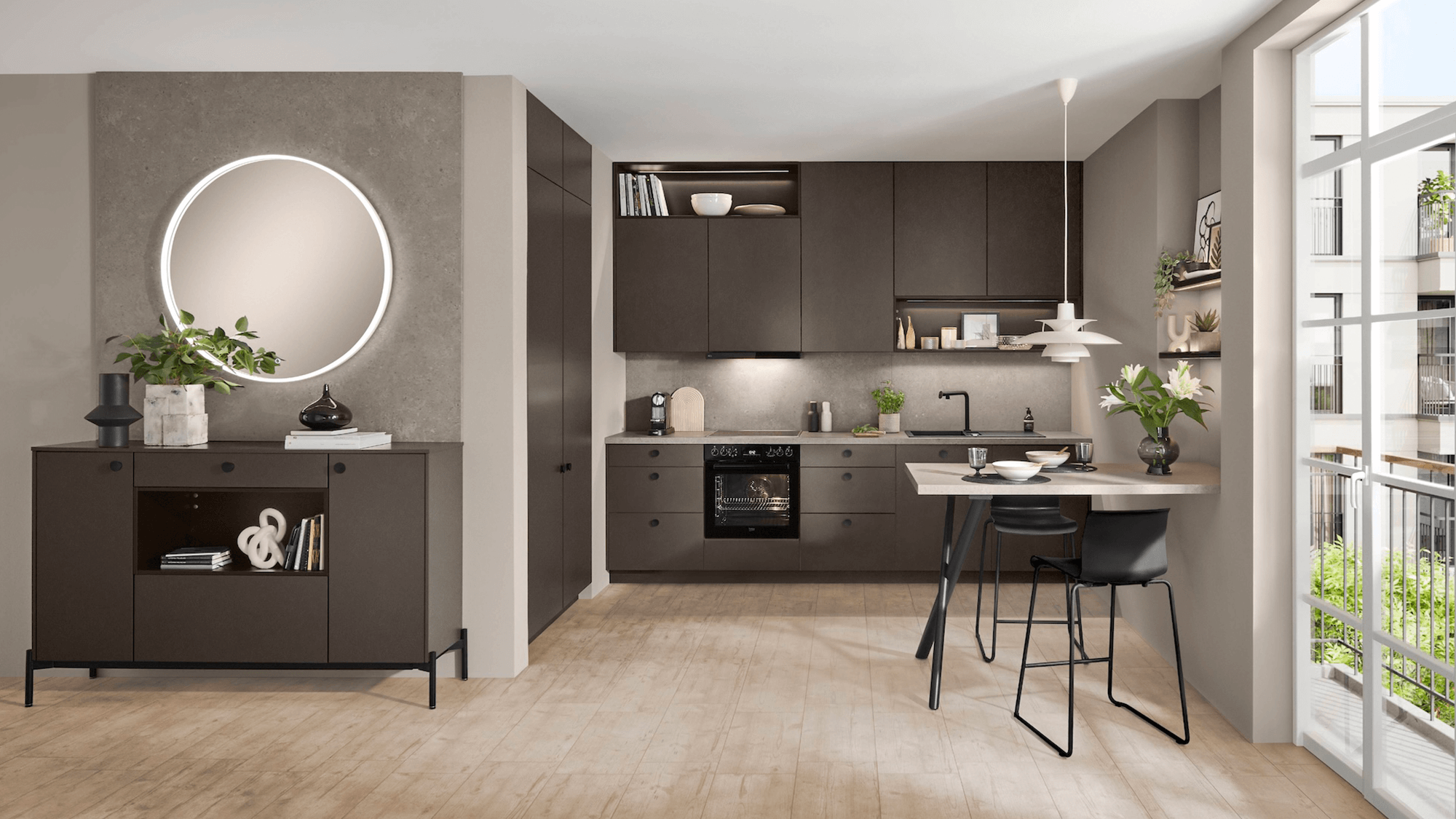 Diese Nobilia Look moderne Küchenzeile überzeugt mit modernem Charme und ist die ideale Küche für kleinere Küchenräume oder Stadtwohnungen. Die matten Fronten in Taupe verleihen der Küchenzeile mit Hochschrank Tiefe und fungieren als eine Art Rahmen. In dieser Nobilia Küche ist jedes Element durchdacht platziert: Der Esstisch lädt zu einer kurzen Kaffeepause oder zum gemeinsamen Abendessen ein, während der wandbündige Hochschrank großzügigen Stauraum bietet. Offene Holzregale setzen natürliche Akzente und geben dem Raum eine wohnliche Note. Die Arbeitsplatte in grauer Betonoptik setzt einen kühlen Kontrast und begeistert mit robusten Materialeigenschaften. Schwarz abgesetzte Griffe und Armaturen fügen sich harmonisch ins Gesamtbild ein, sie sind griffig und betonen das klare Küchendesign, ohne herauszustechen.