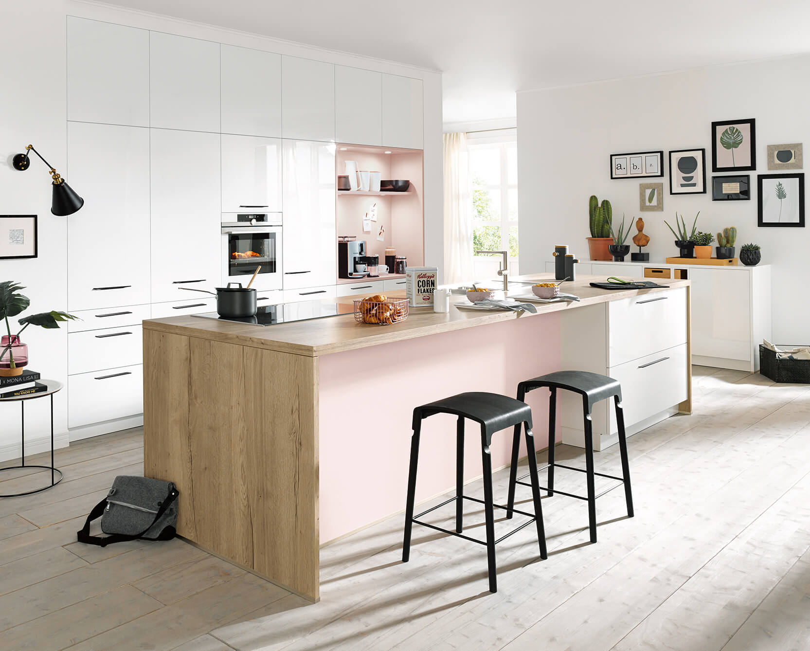 Diese Schüller moderne Inselküche Kristallweiß besticht mit klassischer Eleganz und viel Liebe zum Detail. Die weißen Küchenfronten in Hochglanzoptik erhellen den Raum und bringen die Küche zum Strahlen. Die Nischenverkleidung und die Inselrückwand sind in einem frischen Rosaton gehalten, der einen schönen Kontrast erzeugt. Diese gezielten Farbtupfer brechen das schlichte Design der Inselküche auf und erschaffen eine einzigartige Küchenkomposition.