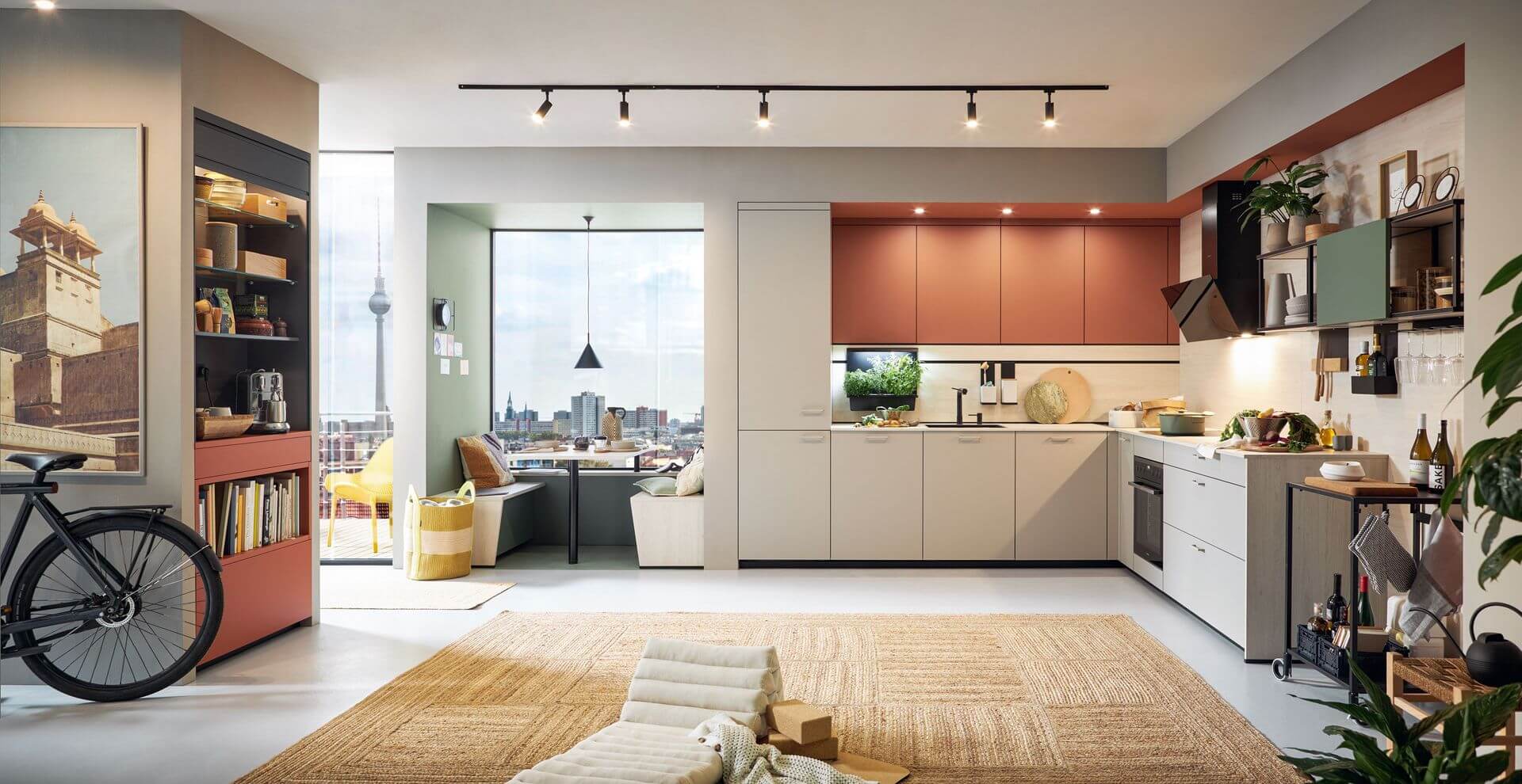 Die „Next Generation Küche“ symbolisiert den Fortschritt im Küchendesign. Kieselgrau matt – ein zeitloser Farbton mit Anti-Fingerprint-Eigenschaften – definiert den Grundton. Er wird geschickt durch zwei dynamische Farbvarianten, Orientrot matt und Eukalyptusgrün matt, ergänzt. Dieses kreative Farbenspiel verleiht nicht nur ein einzigartig freundliches Raumgefühl, sondern zieht sich auch bis in die gemütliche Essnische hinein.